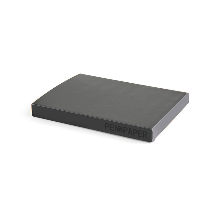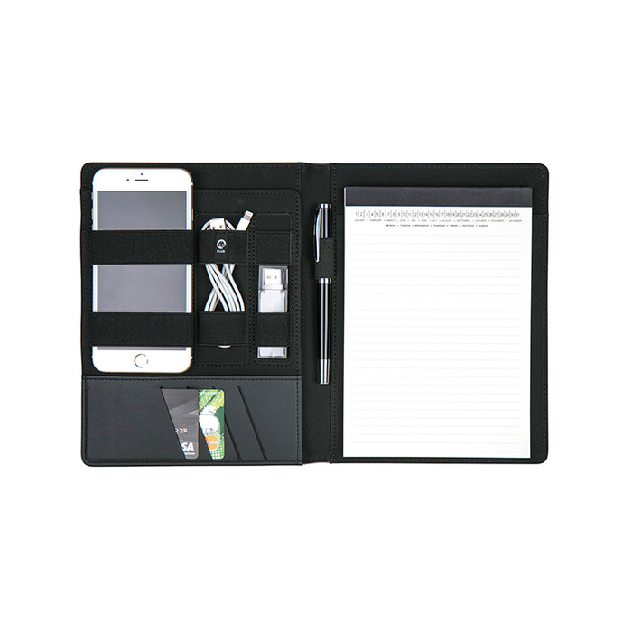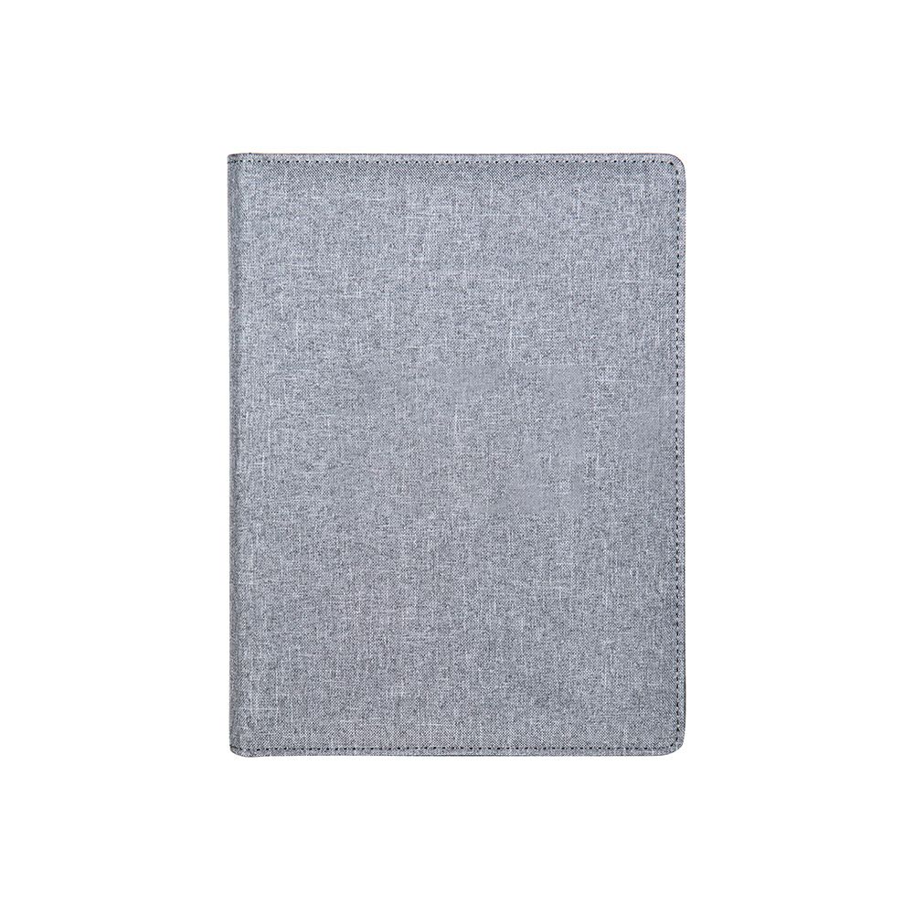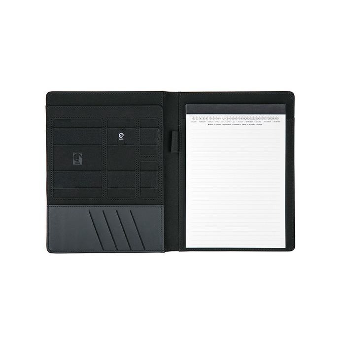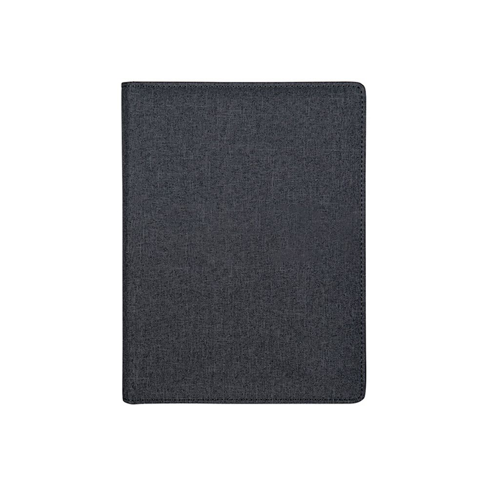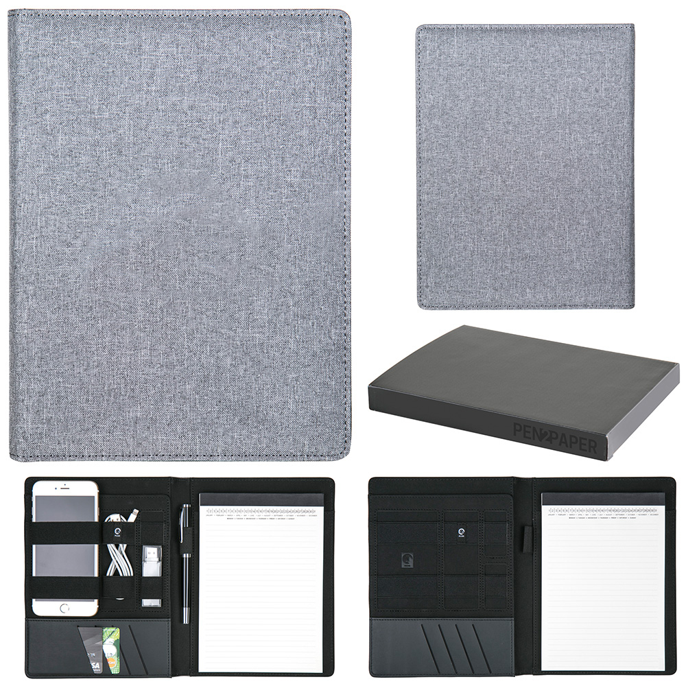 Linen Jr. portfolio with modern design and features. Includes interior pen loop, pockets for cards and documents, and elastic binding for organizing devices and cables. 60 page lined pad. Handsome matte black gift box included.